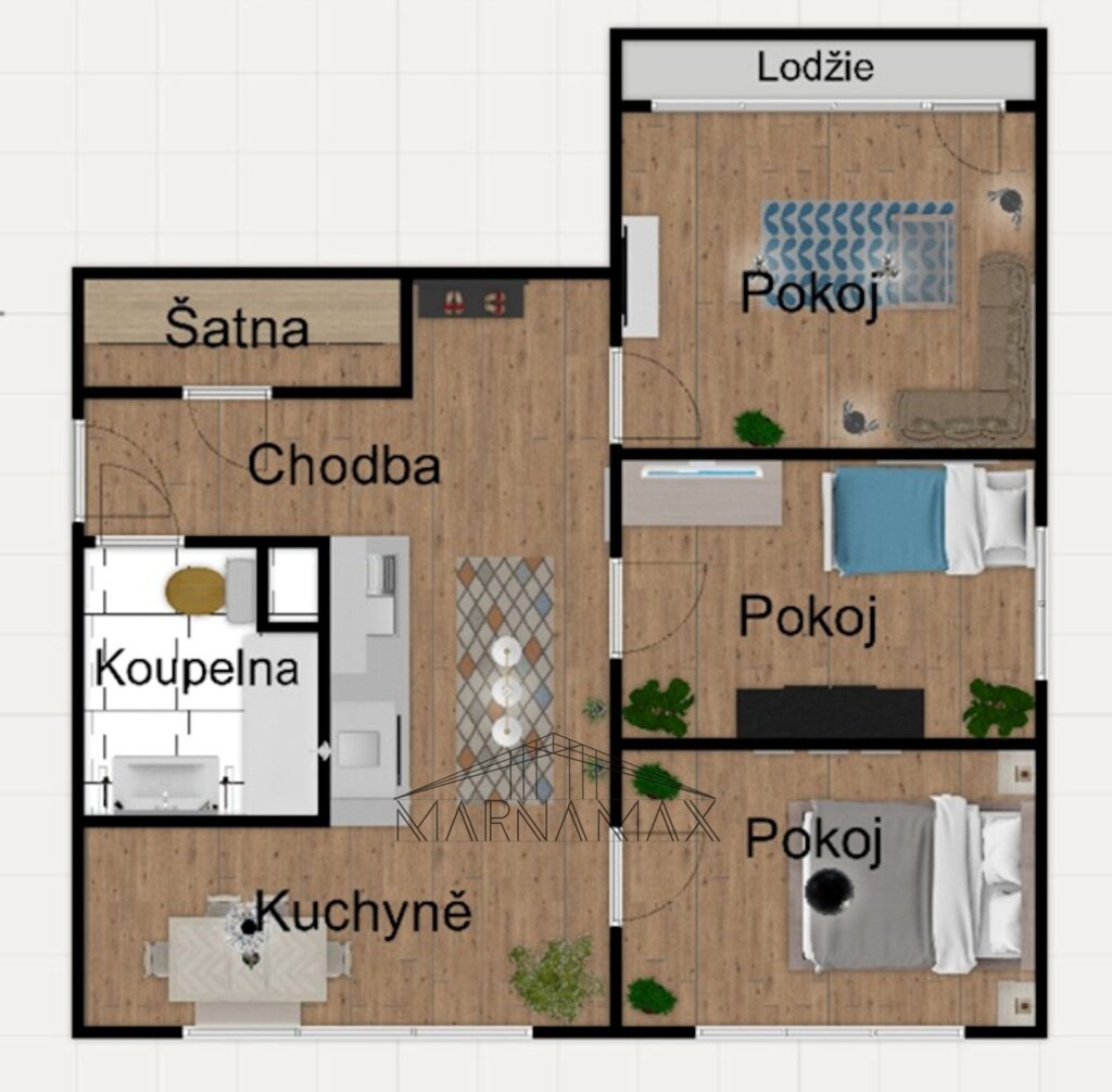 – světlý obývací pokoj s přístupem na lodžii o rozloze 18,5m2 resp. 3,61m2